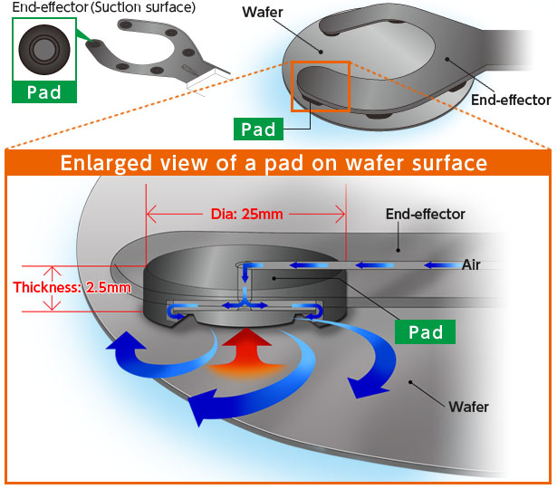 그 결과, 사이클론 패드와 웨이퍼의 사이에 에어층이 발생해, 비접촉으로의 떠 오르는 것이 가능하게 됩니다.