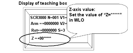 (When the robot is $1, the commands are: $1WLO ****) Input the Z-axis value displayed in the teaching box in "DEC". Obtain the current designated dataData to be set |